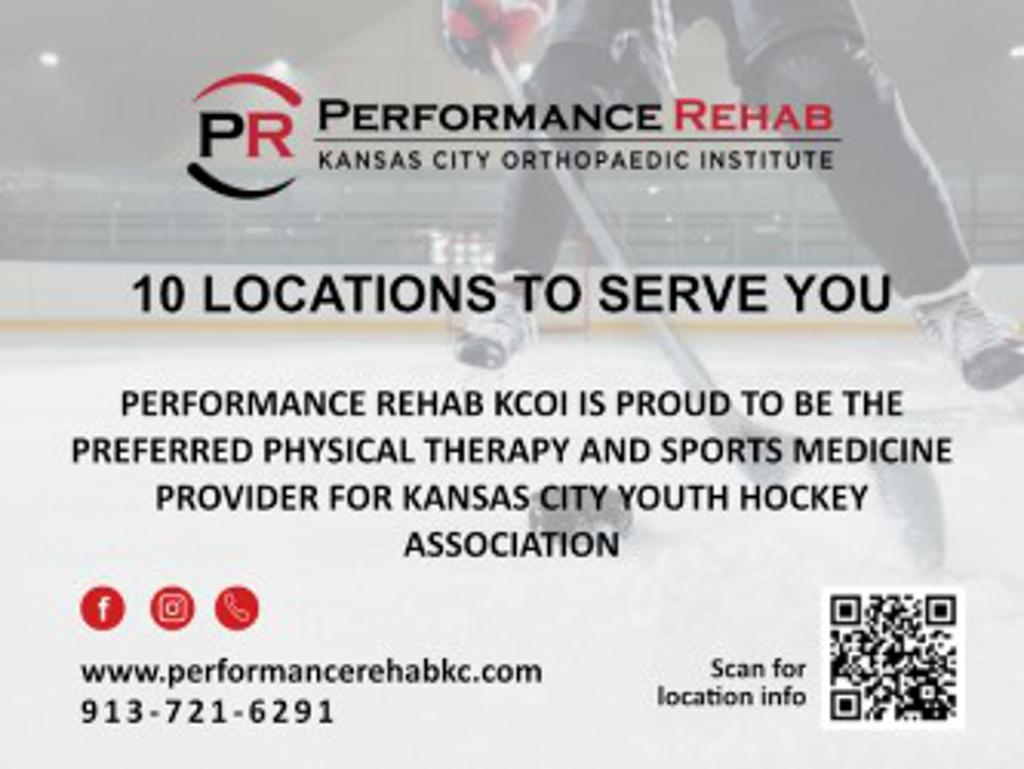 Performance Rehab/Kansas City Orthopaedic Institute is proud to be the preferred physical therapy and sports medicine provider for KCYHA. This is our 3rd season partnering with PR who has 16 locations in the Kansas City area to serve our members. Next time you see one of their Athletic Trainers at the rink tell them thanks!
