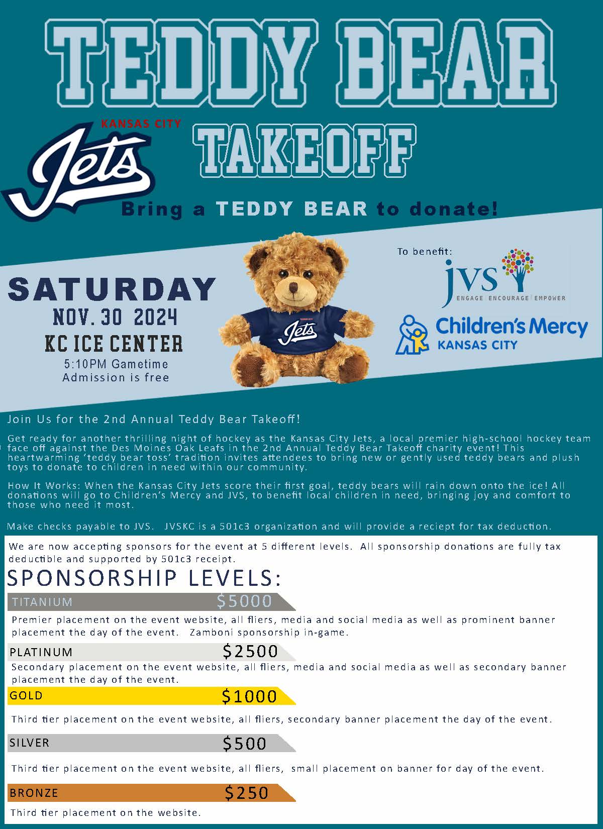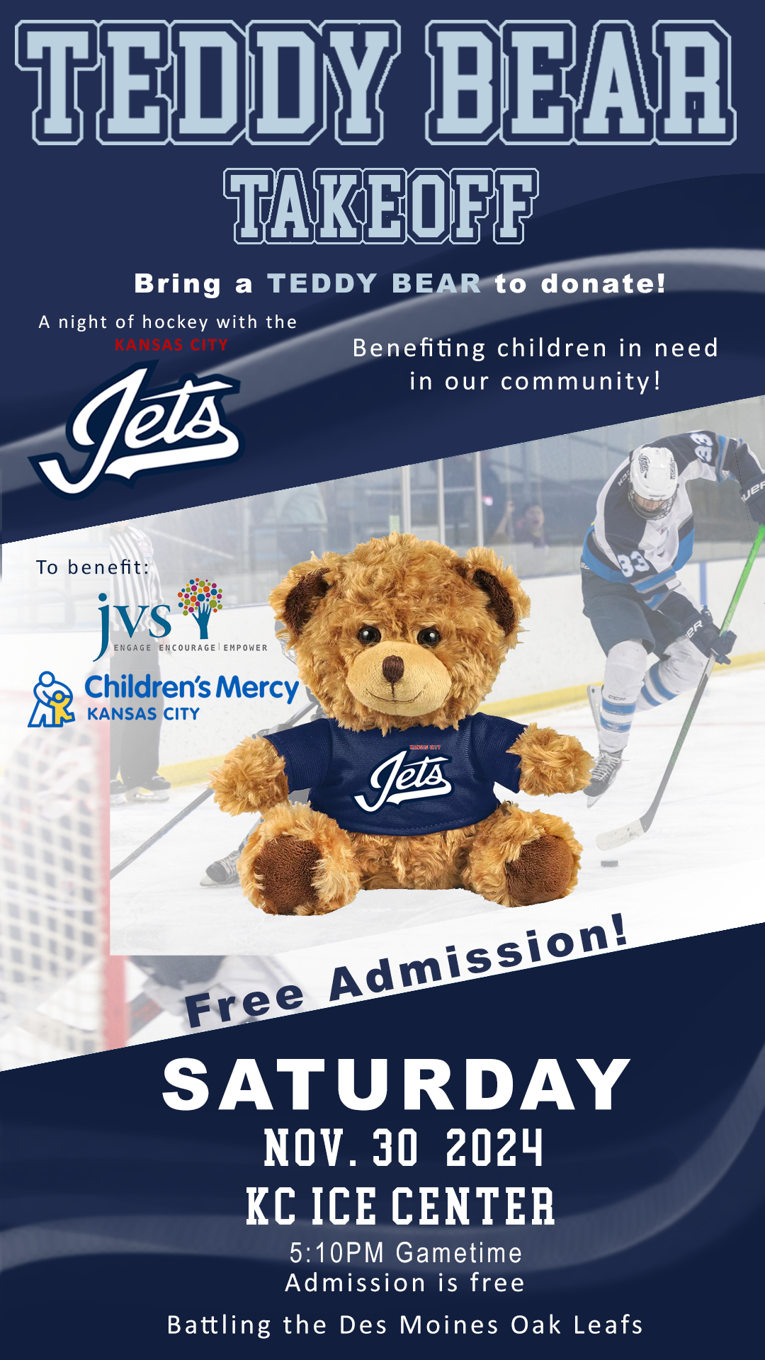 We're thrilled to announce the 2nd annual charity event hosted by the Kansas City Jets that combines exciting hockey action with a meaningful charitable cause where we will be giving back to children in need in our community —The Teddy Bear Takeoff.