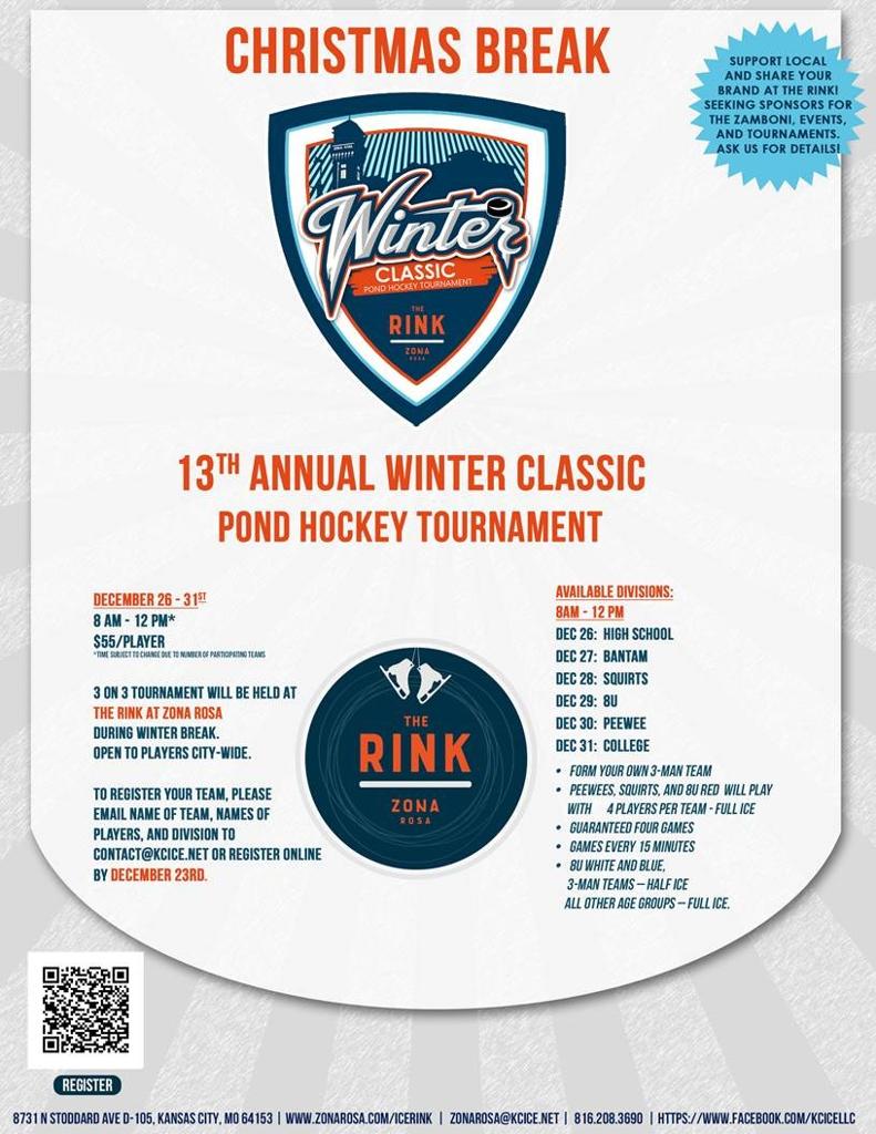 KCIce is pleased to Present and Host our 13Th Annual Winter Classic Christmas Pond Hockey Tournament at the Rink at Zona Rosa. Schedule below. Each Tournament will start at 8:00am unless notified otherwise based on number of teams entered and will be communicated to all teams. Players and Teams can register online: https://www.zonarosa.com/the-rink-at-zona-rosa/ then select Make a Reservation button and select the 13th Annual Winter Classic Pond Hockey Tournament.