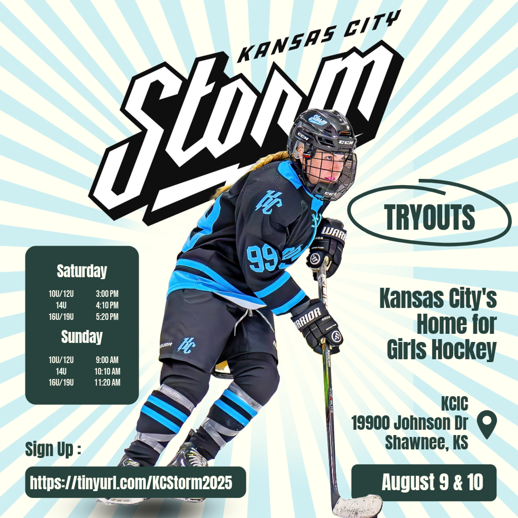 - Storm tryouts will be August 9-10, 2025 at KC Ice Center in Shawnee, KS.