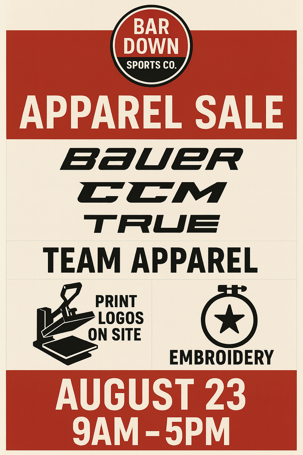KCYHA Families - Bar Down Sports Company is clearing out their Bauer, CCM and True team apparel during a one day sale.