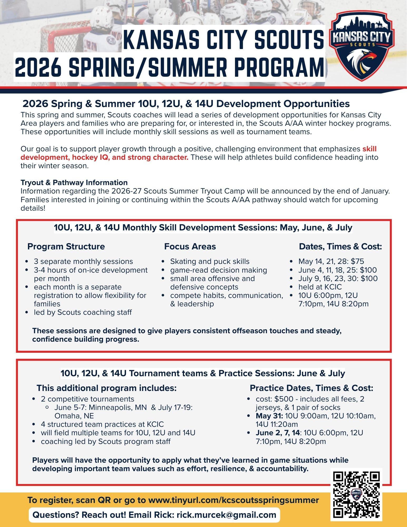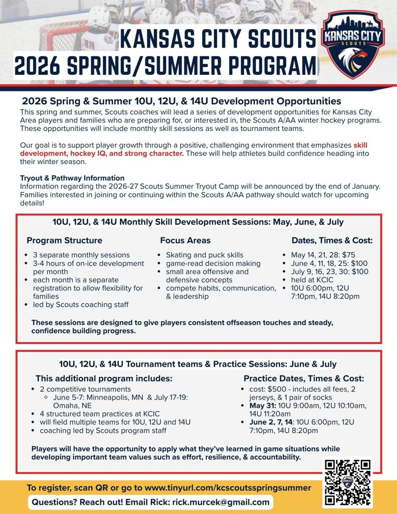 This spring and summer, Scouts coaches will lead a series of development opportunities for Kansas City Area players and families who are preparing for, or interested in, the Scouts A/AA winter travel hockey programs. These opportunities will include monthly on-ice skill sessions as well as tournament teams.